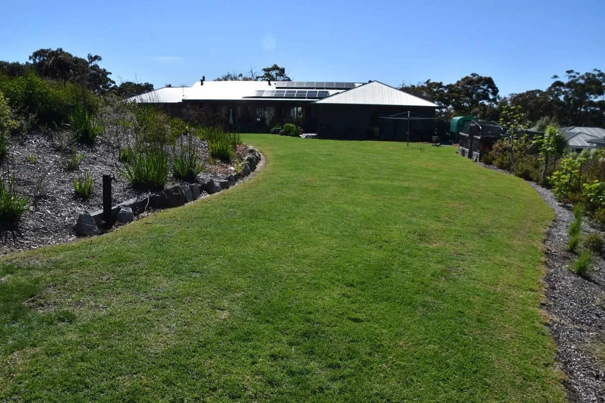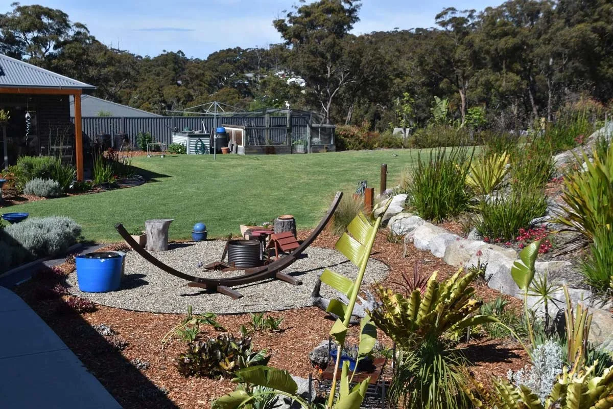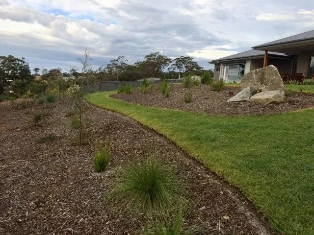 After assessing the land, we decided that the key to the garden’s success would be curves—incorporating them in the lawn design to suit the client’s ride-on mower and soften the visual appeal of the large space. We also wanted to ensure that the garden required minimal maintenance, particularly to withstand harsh weather conditions and the risk of bushfires.